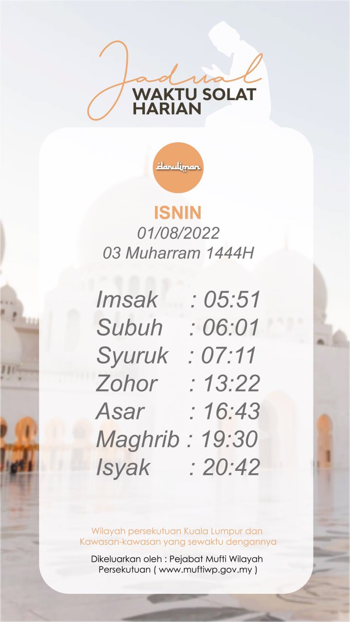Pustaka Darul Iman On Twitter Jadual Waktu Solat Hari Ini Wilayah Persekutuan Kuala Lumpur Dan Kawasan Kawasan Yang Sewaktu Dengannya Isnin 01 08 2022 Bersamaan 03 Muharram 1444h Jom Klik Telegram